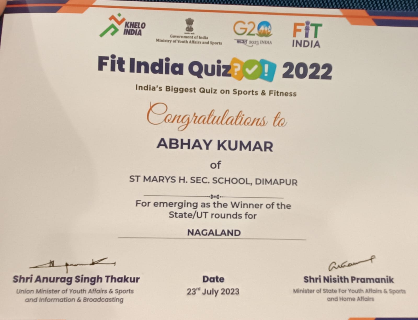 ✦Nagaland State Champions of FIT INDIA QUIZ 2022